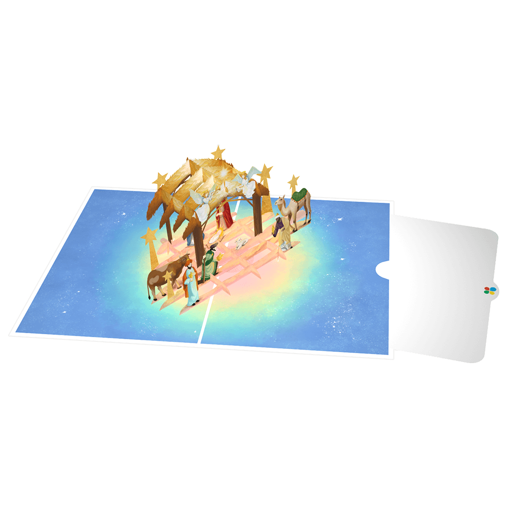 Celebrate the magic of Christmas with this exquisite nativity scene pop-up card. Featuring intricate three-dimensional craftsmanship, it brings the timeless story of the Nativity to life in stunning detail.